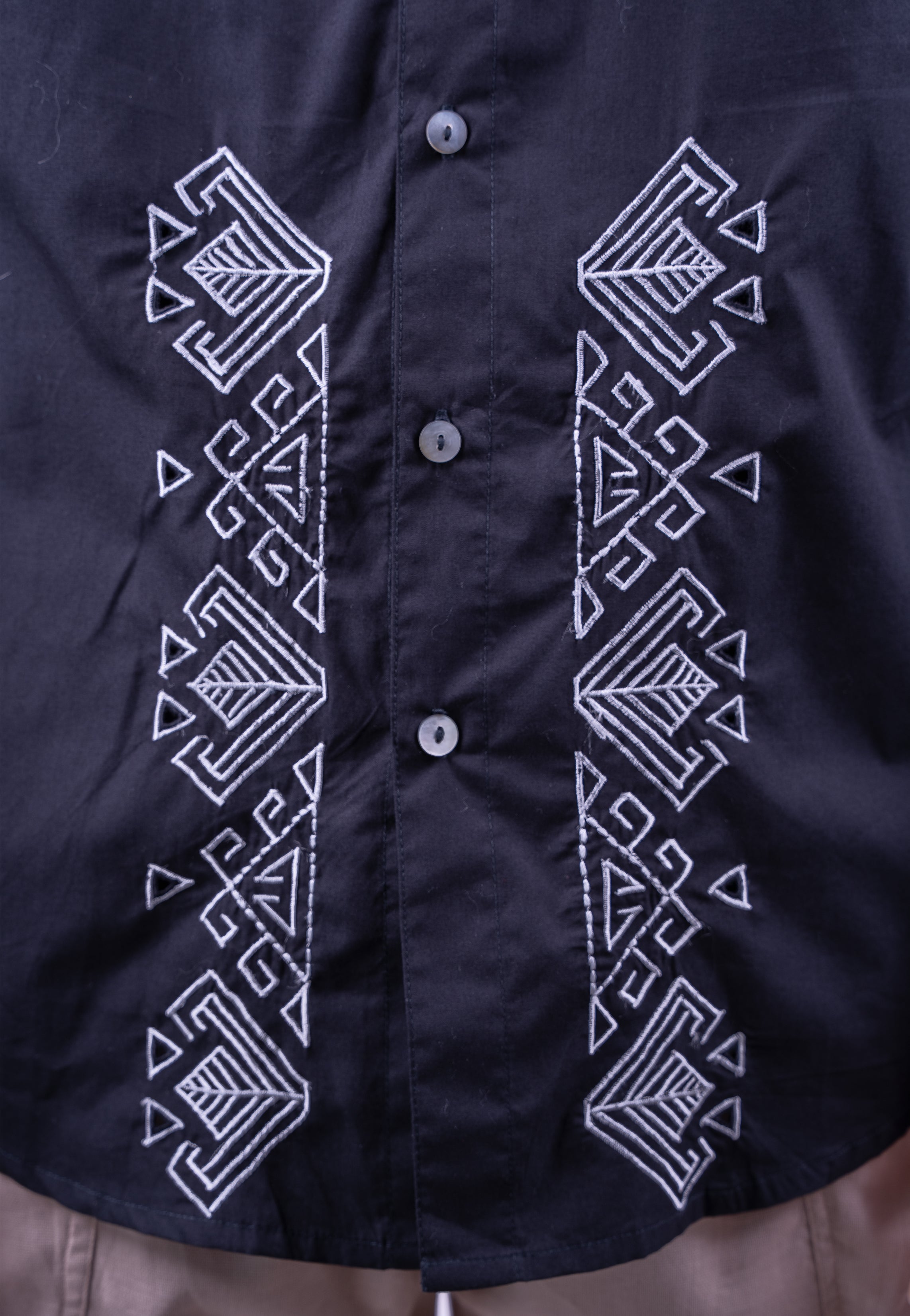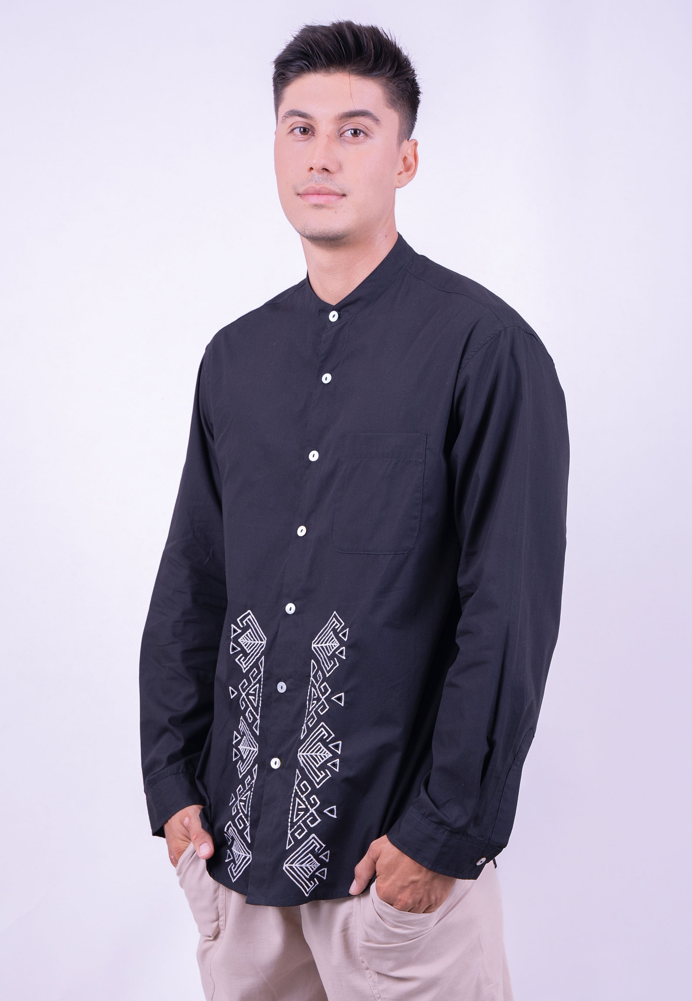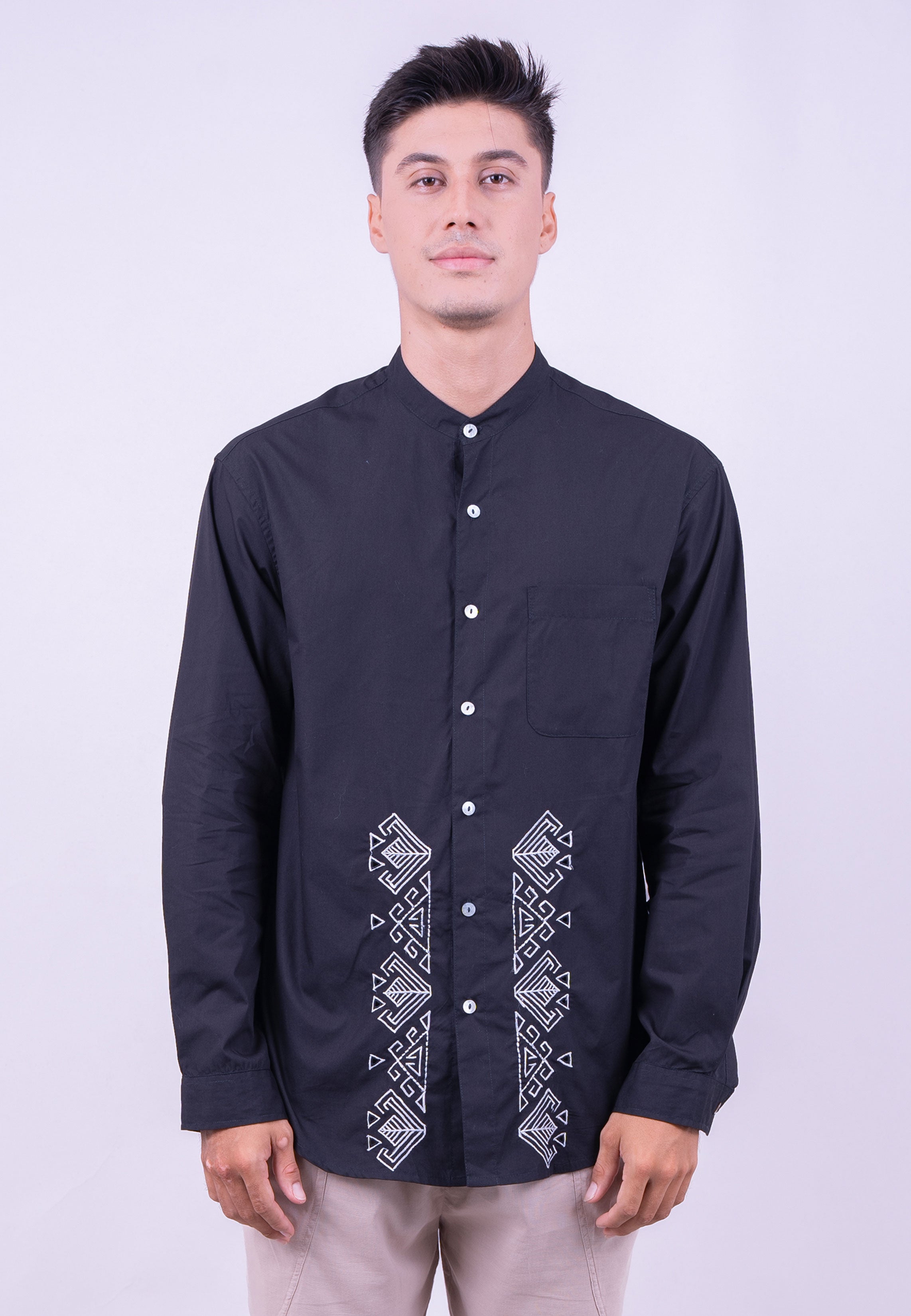A perfect fusion of traditional artistry and modern minimalism. This Long-Sleeve Mandarin Shirt is defined by its striking geometric embroidery and sophisticated silhouette, making it an essential piece for the contemporary man