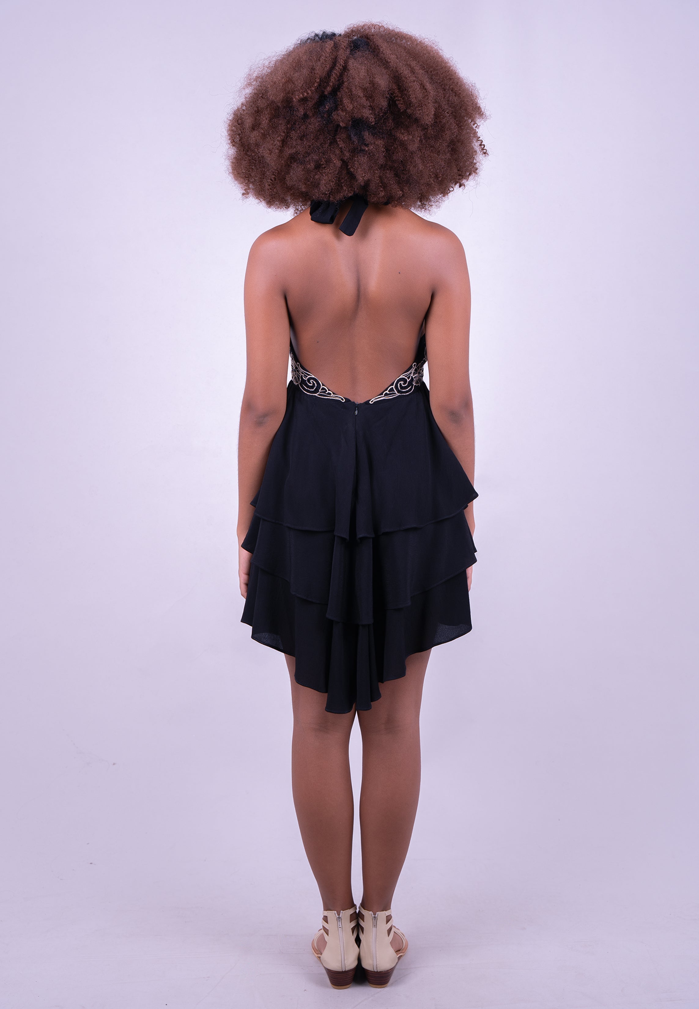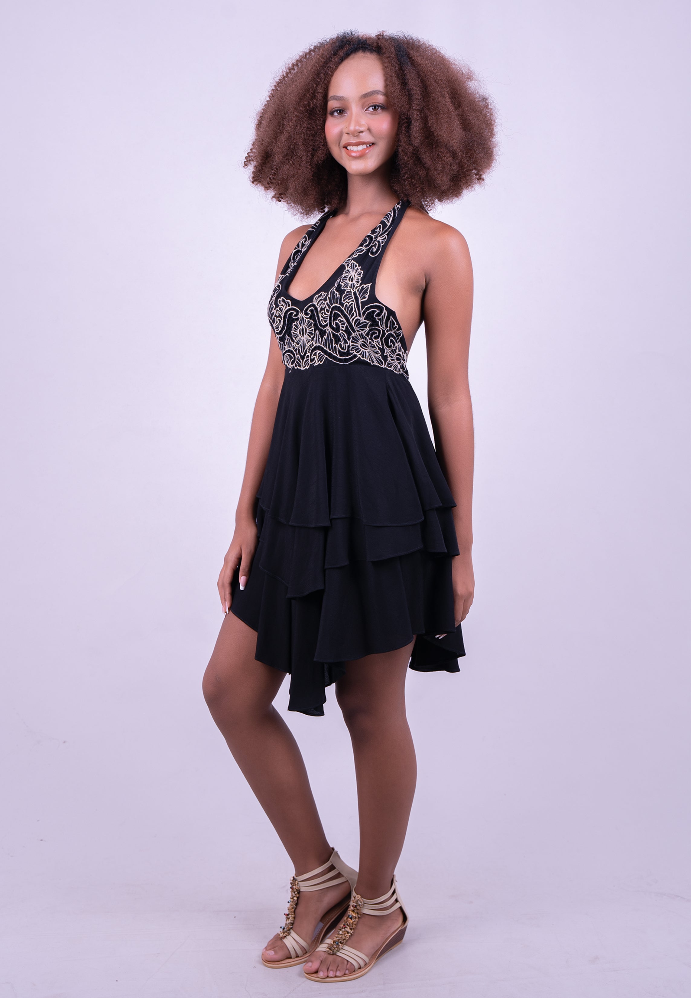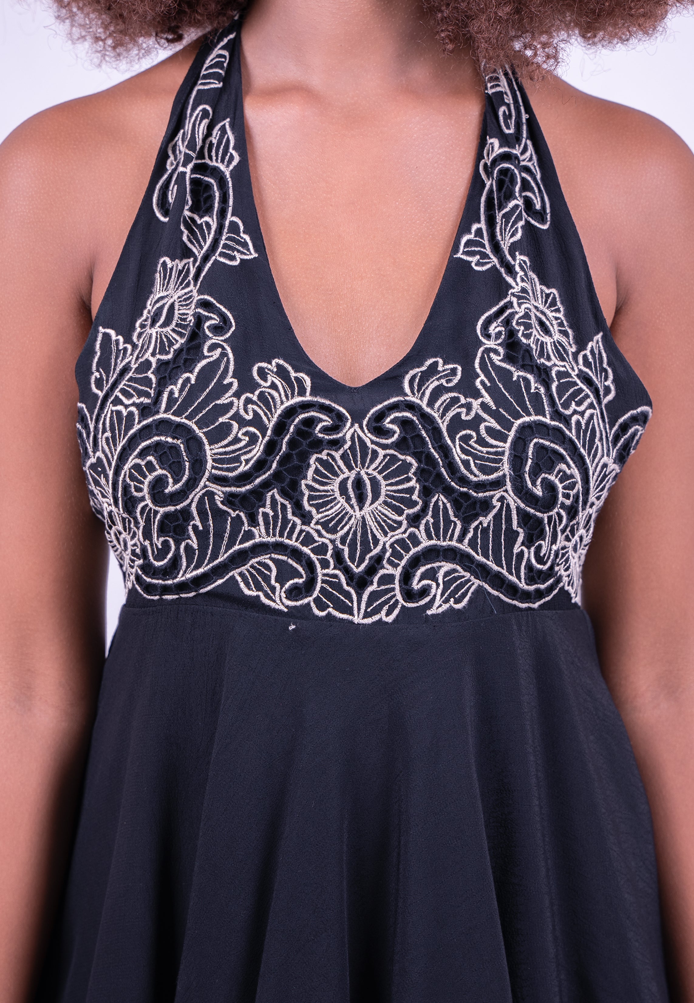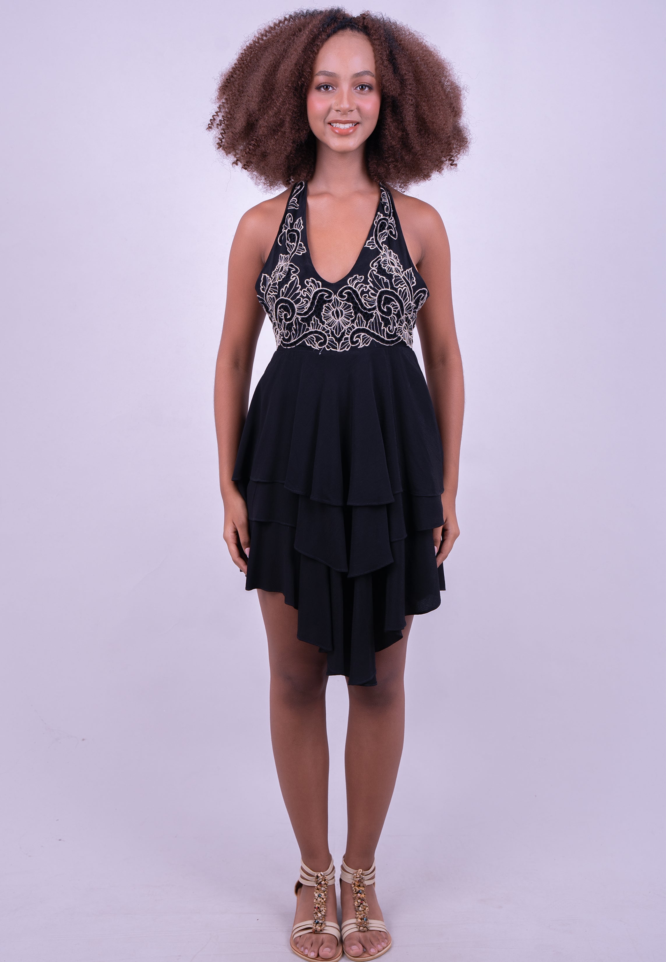 This elegant black halter dress features a sophisticated tiered ruffled skirt with a dramatic high-low hemline that creates graceful movement. The design is elevated by intricate cream floral embroidery and delicate open-work detailing across the bodice for a luxurious artisan finish.