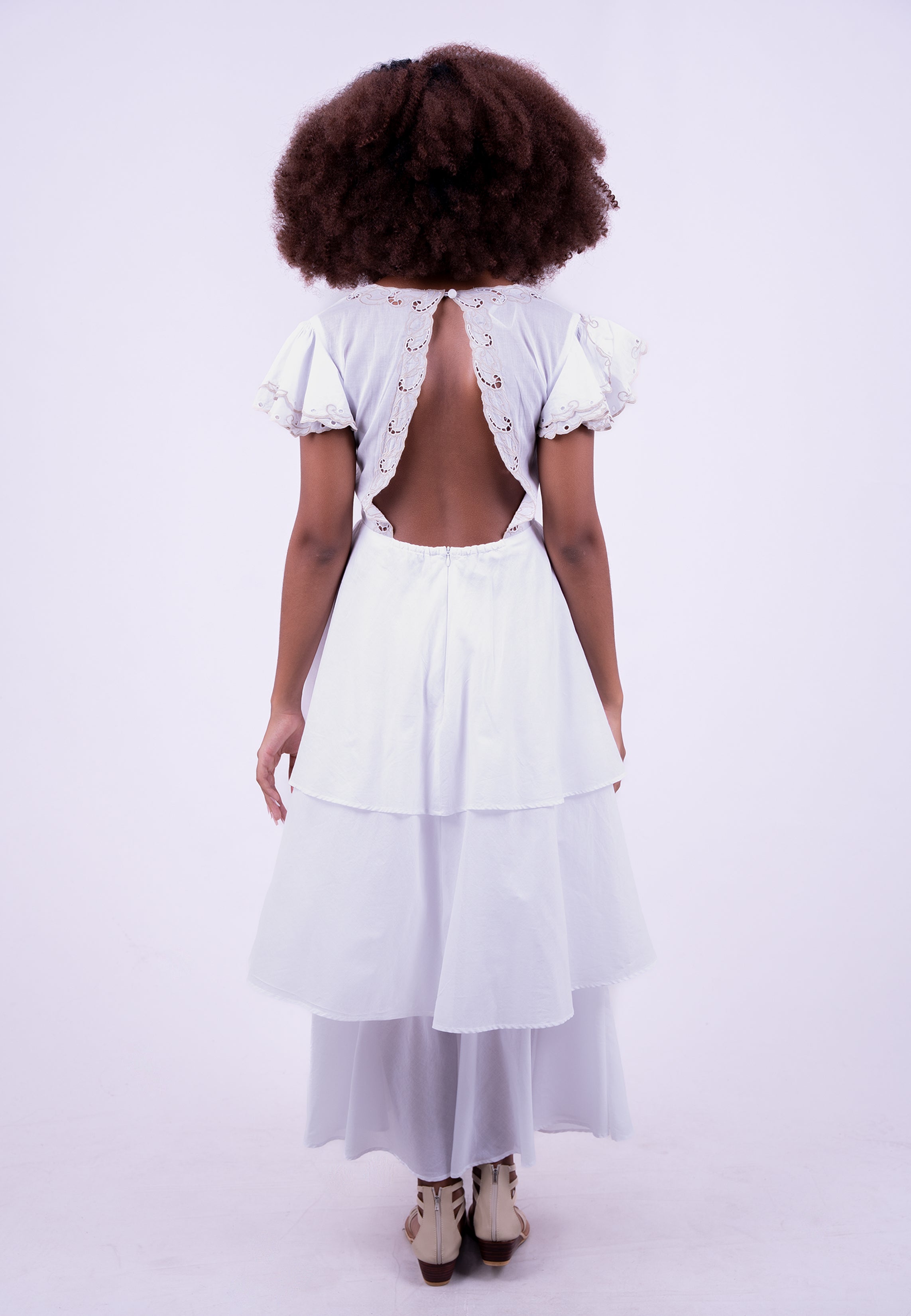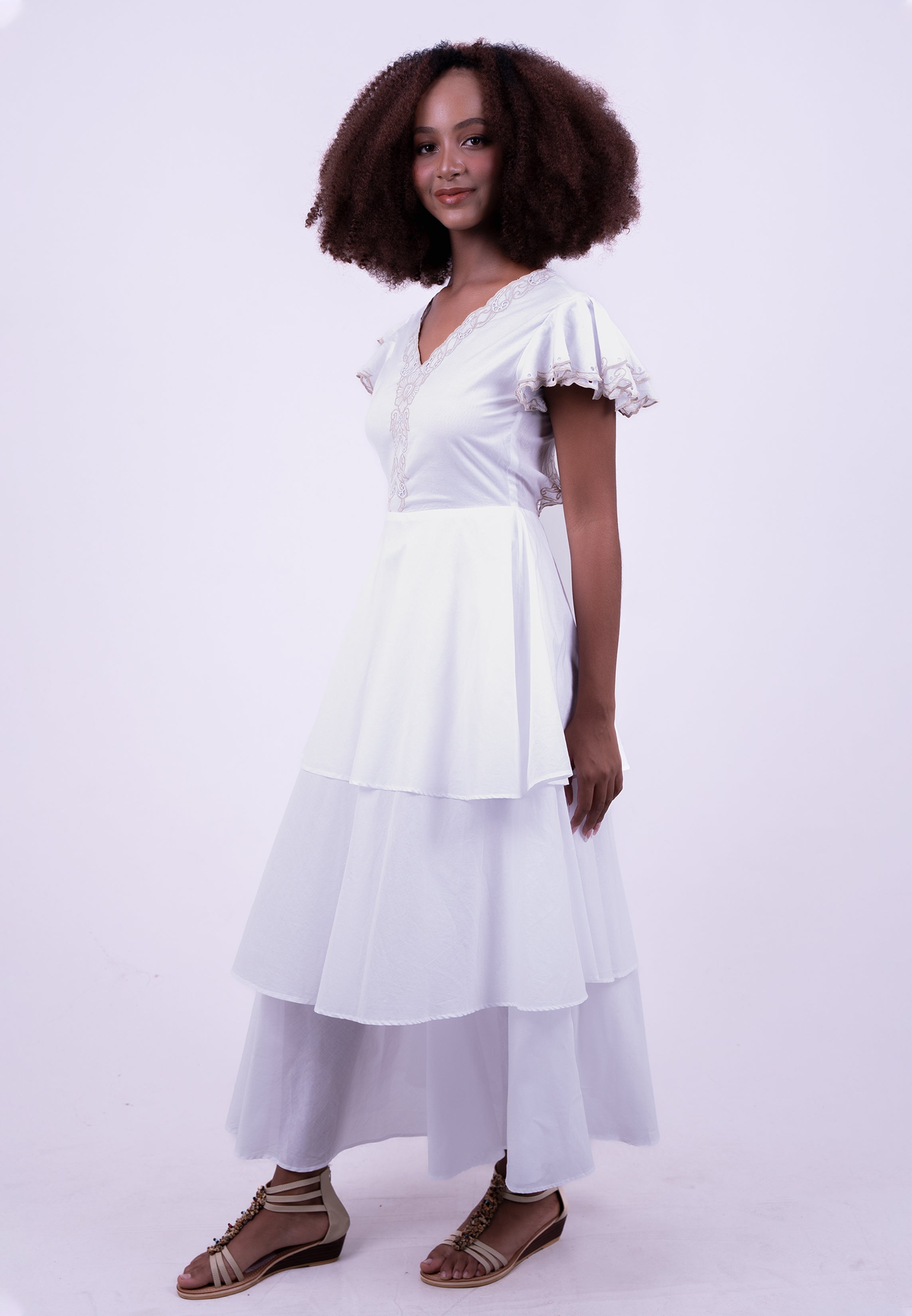 This graceful white maxi dress features a romantic tiered ruffled skirt and flutter sleeves, beautifully accented by intricate cream floral embroidery along the V-neckline. Its airy, floor-length silhouette and delicate artisan detailing make it a sophisticated choice for coastal weddings or elegant resort wear.