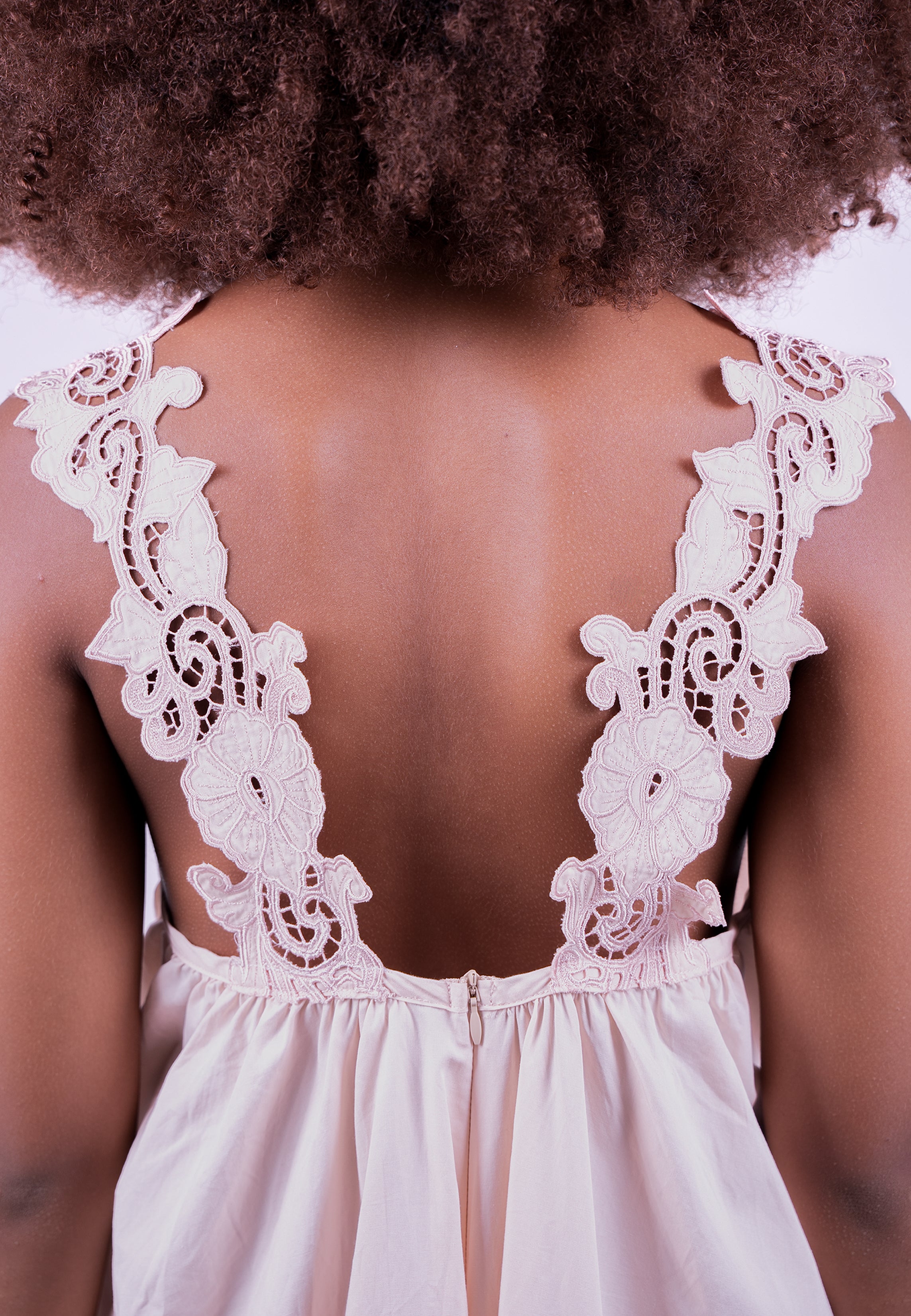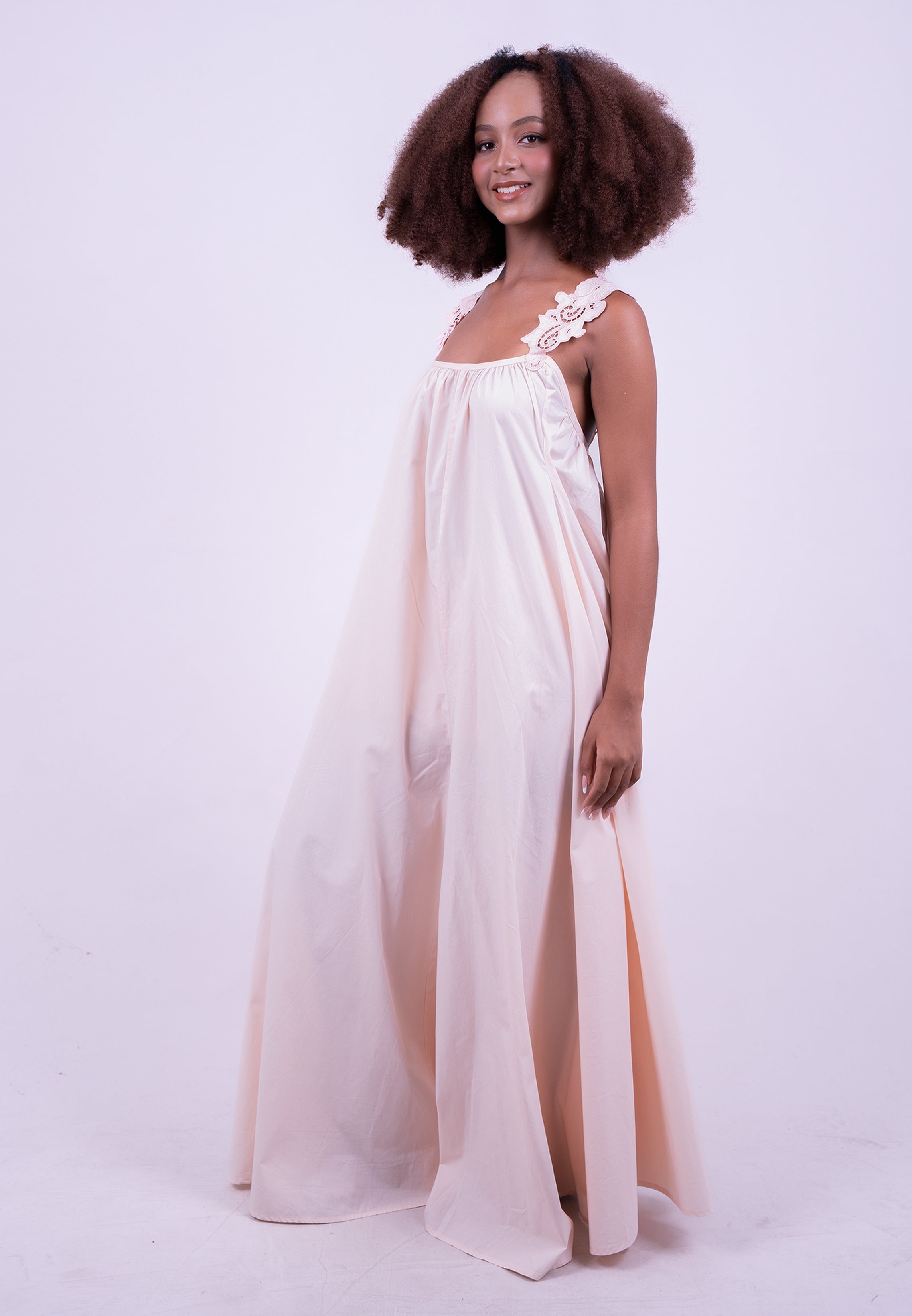 This graceful blush jumpsuit features a wide-leg, floor-length silhouette and delicate floral lace straps for a romantic, feminine aesthetic. Designed with a gathered neckline and a relaxed, airy fit, it offers an effortless blend of comfort and sophisticated resort style.