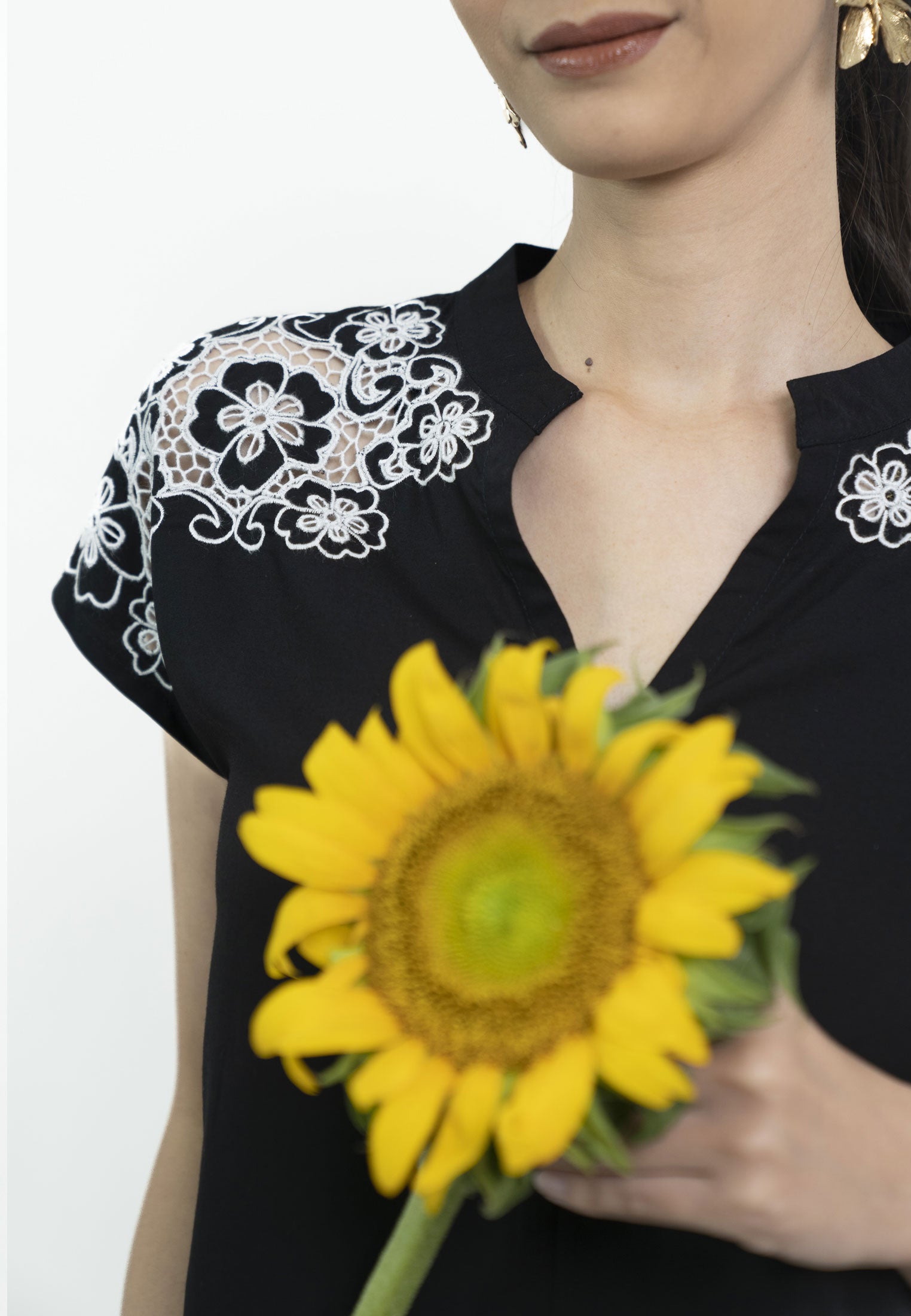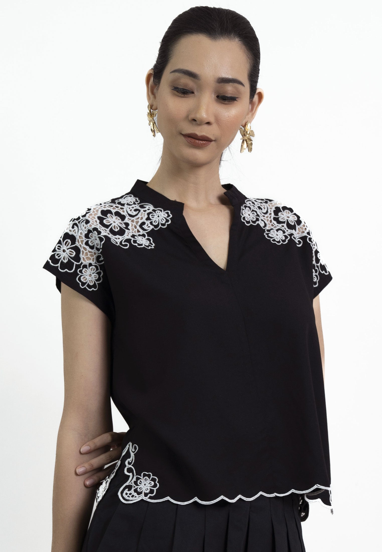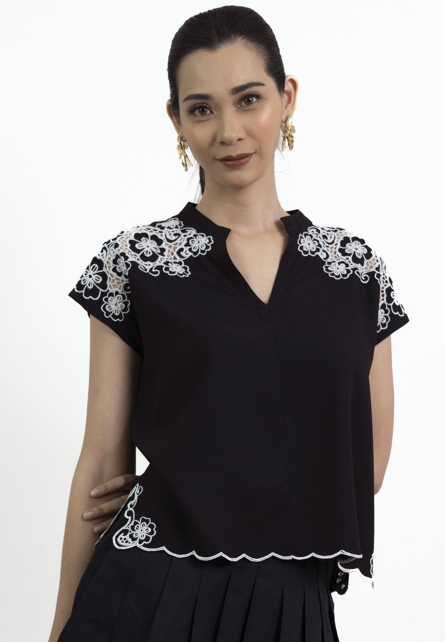 This stylish black top is an elegant addition to any wardrobe, blending classic design with intricate details. It features a sophisticated V-neckline with a band collar, offering a refined touch. The short sleeves are beautifully adorned with elaborate white floral embroidery that extends across the shoulders, creating a striking contrast. A charming scalloped hemline, also outlined in white, adds a delicate finish to the top's relaxed silhouette.