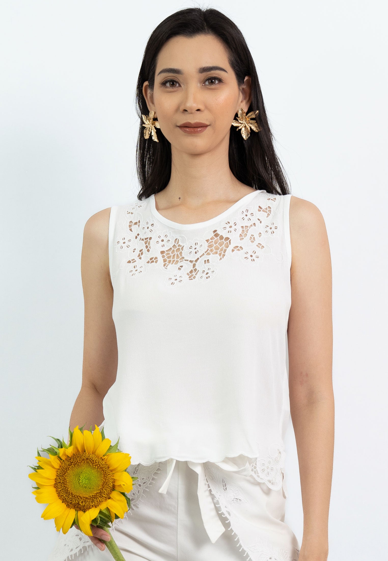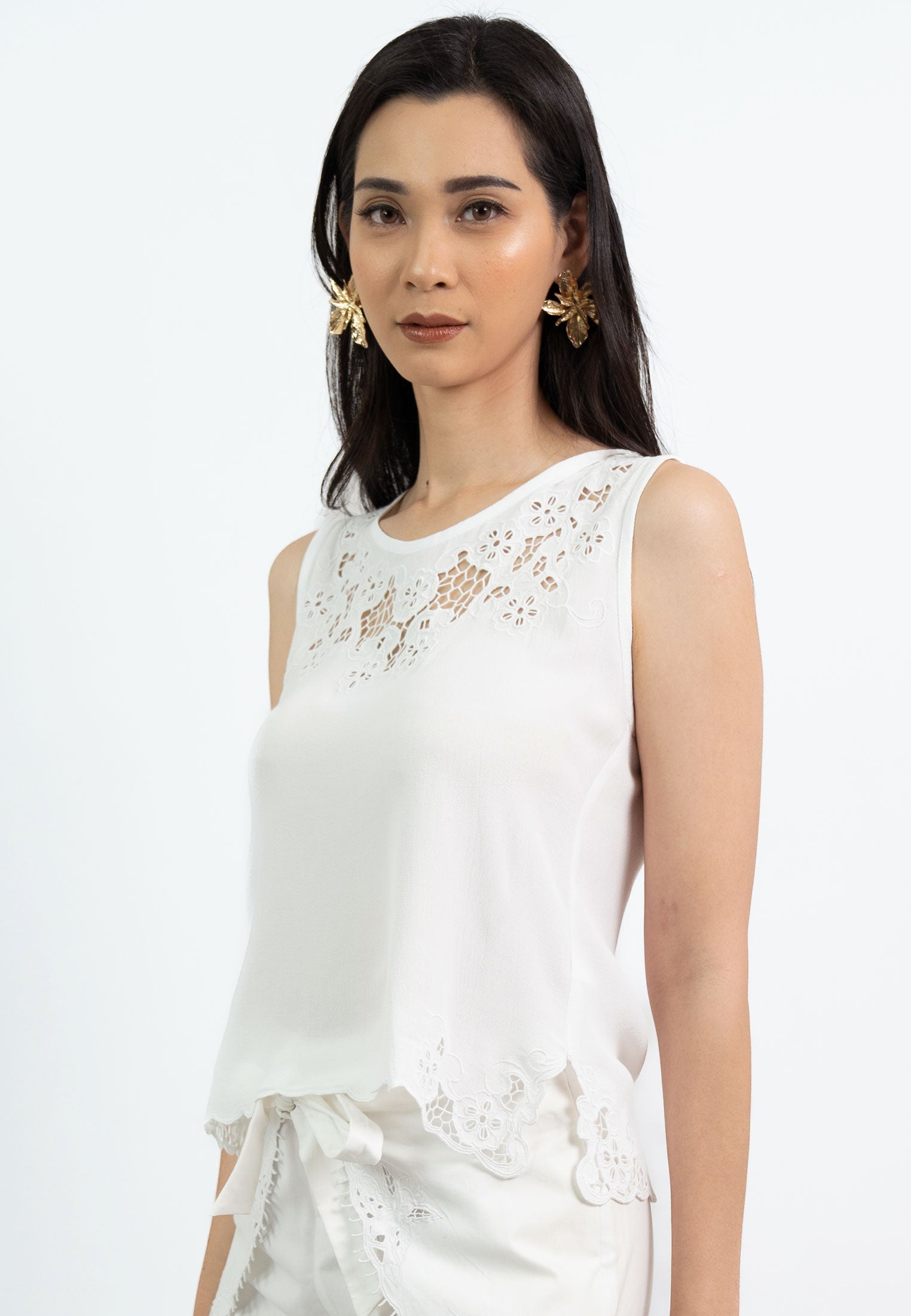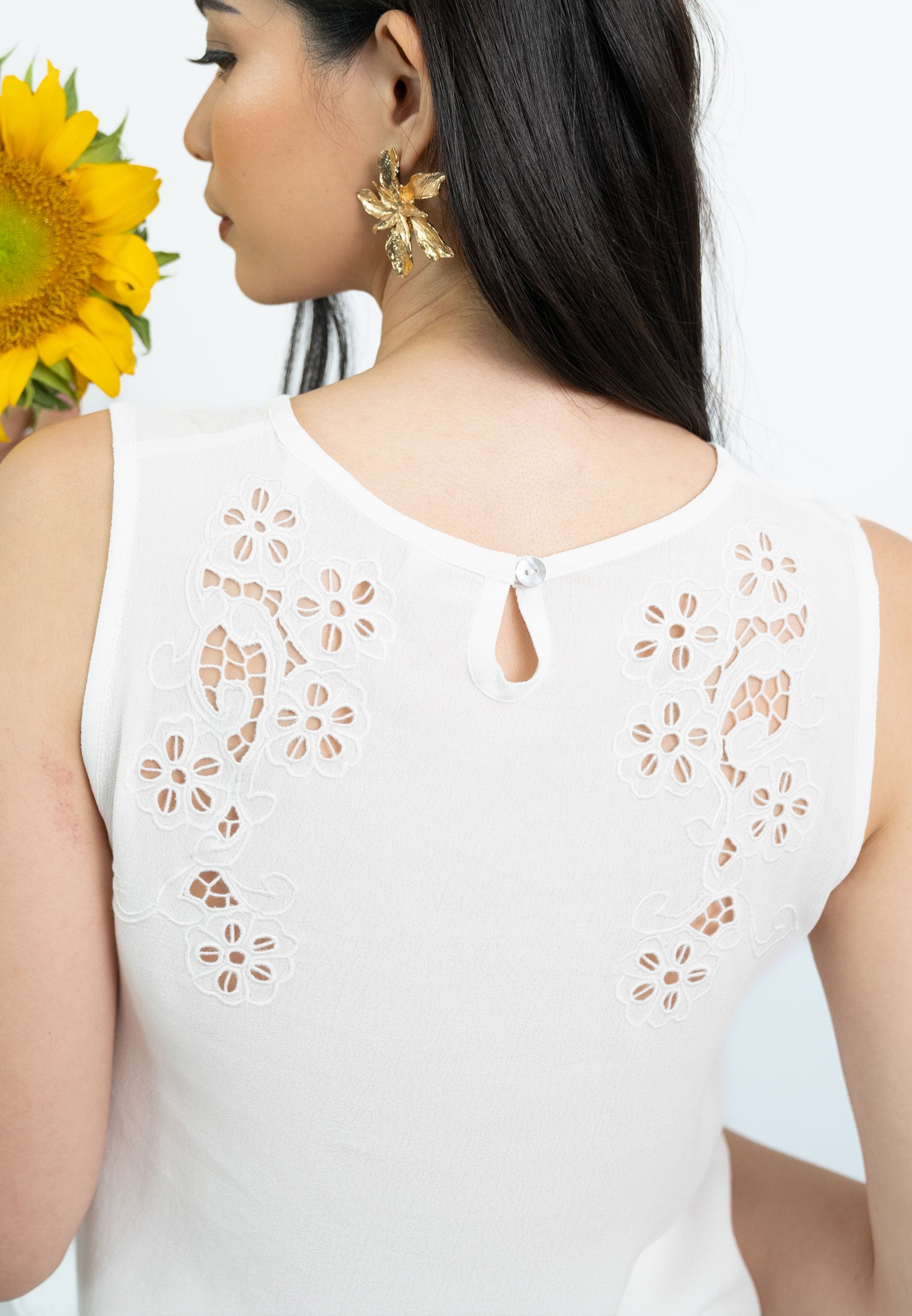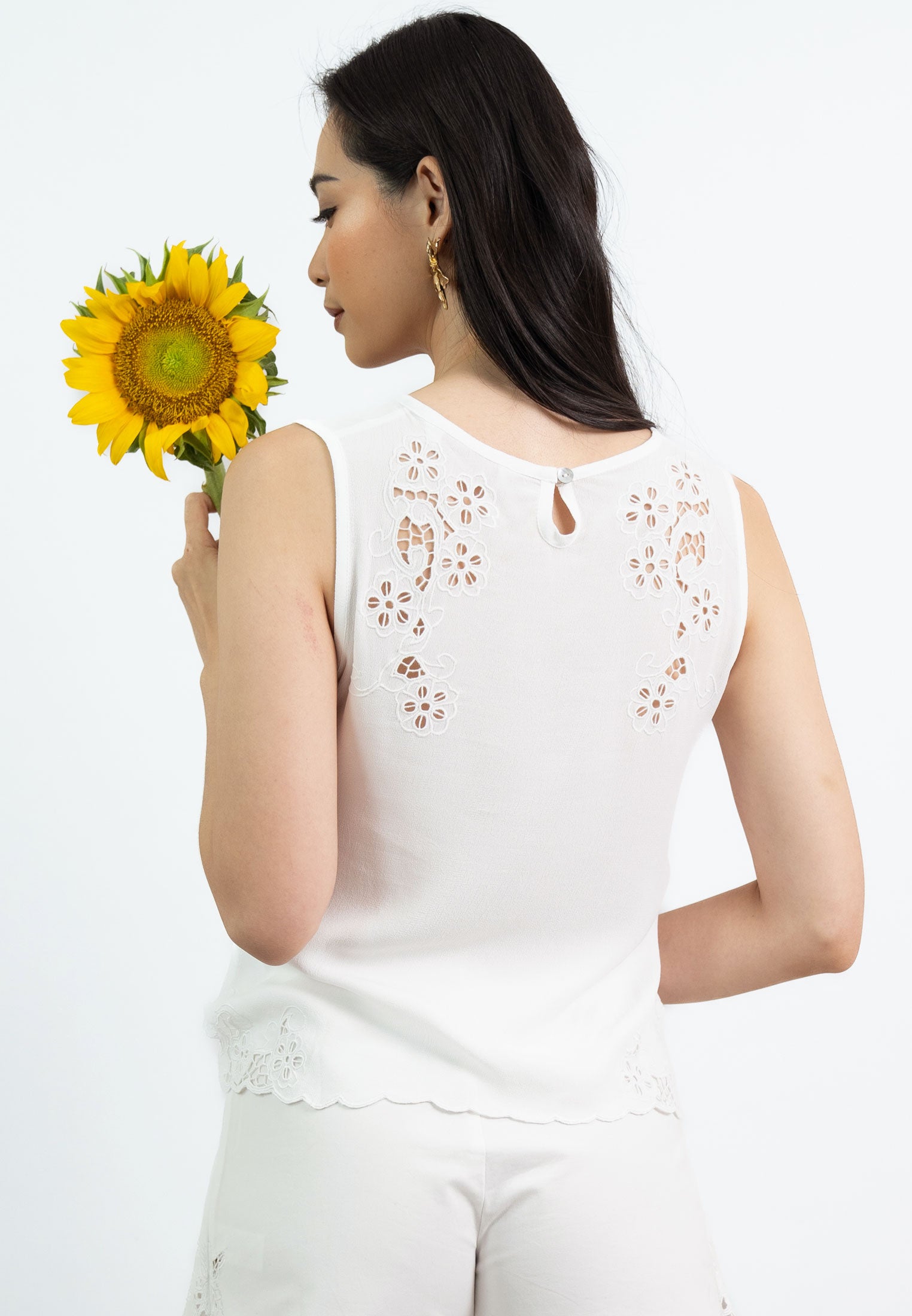 Pelangi Top offers a soft, elegant look with its delicate floral embroidery on the shoulders and scalloped edge detailing at the hem. Featuring a keyhole button closure at the back, this top is a versatile addition to your wardrobe, perfect for layering or wearing on its own for a breezy, refined style.