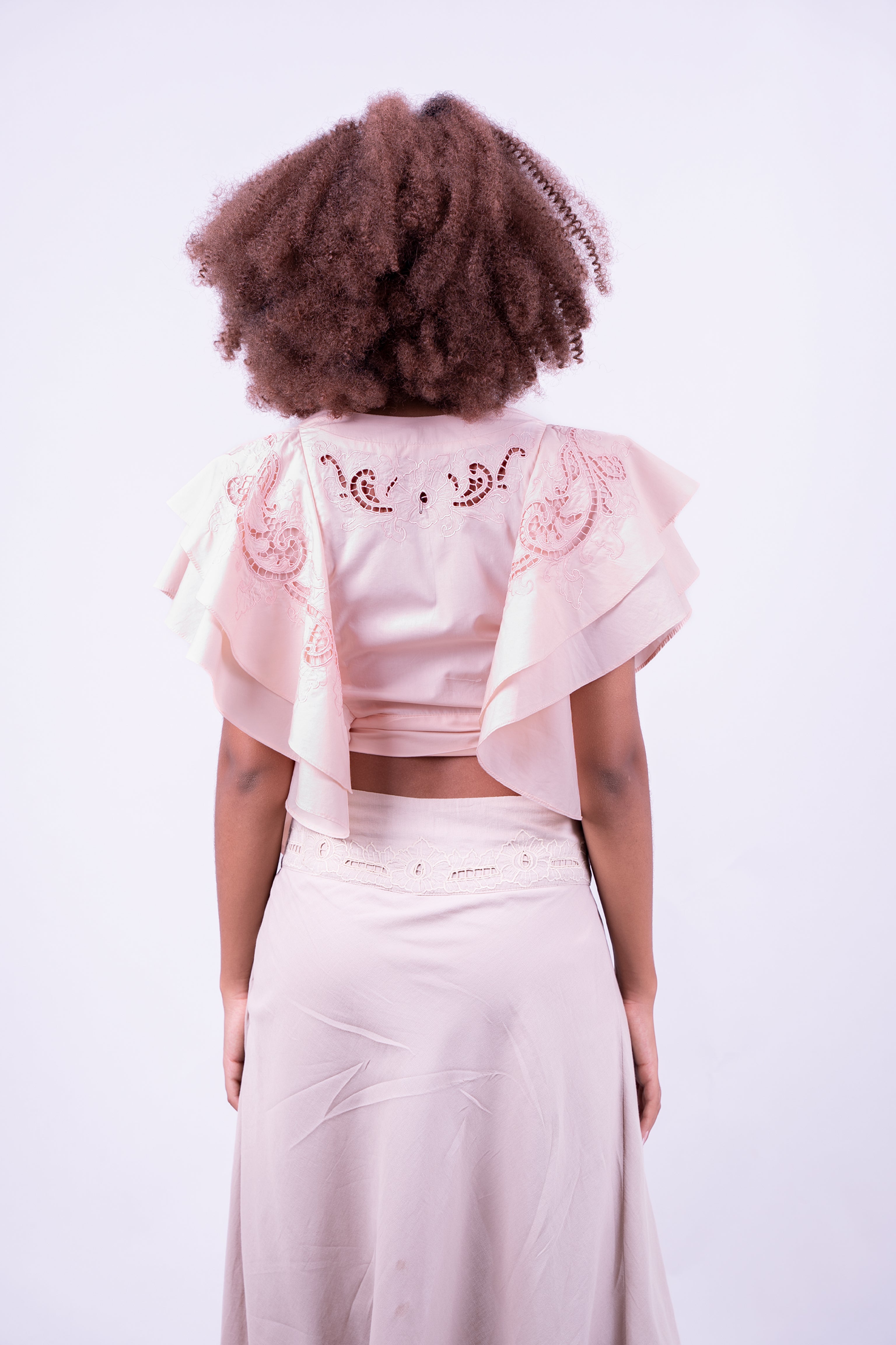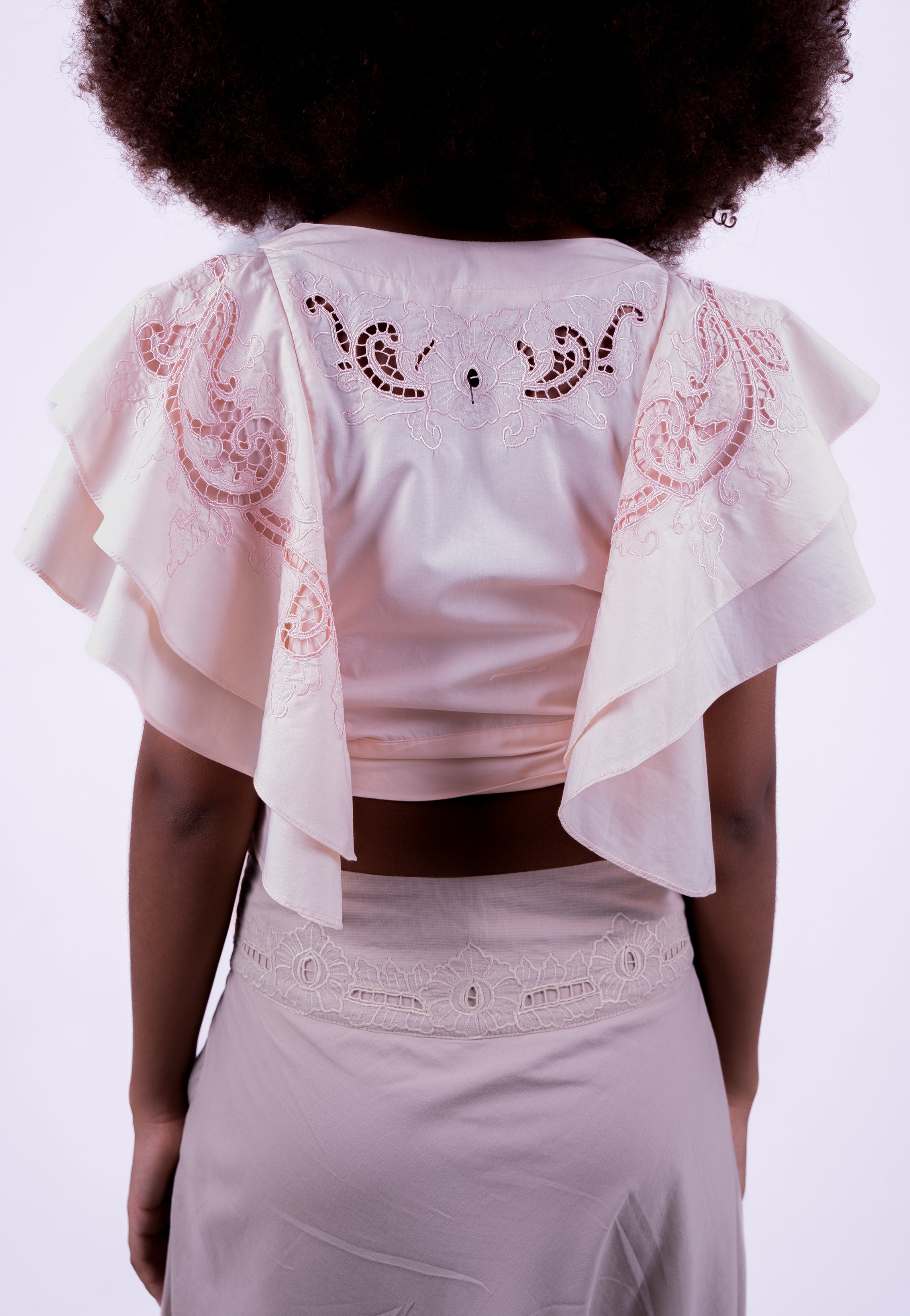 A refined wrap top adorned with delicate embroidery and softly layered ruffle sleeves. Designed to drape beautifully for an effortless, feminine silhouette.